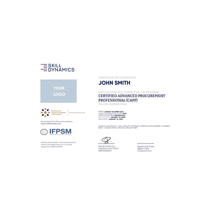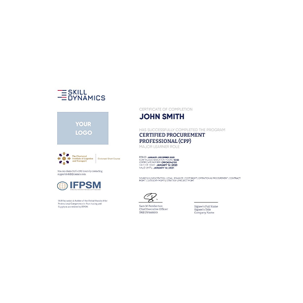 Accredited by the International Federation of Purchasing and Supply Management (IFPSM) and endorsed by the Chartered Institute of Logistics and Transport in the UK (CILT (UK), Skill Dynamics delivers two internationally recognised procurement certifications; Certified Procurement Professional and Certified Advanced Procurement Professional. As well as a certificate, learners receive a digital badge to promote their qualification online.