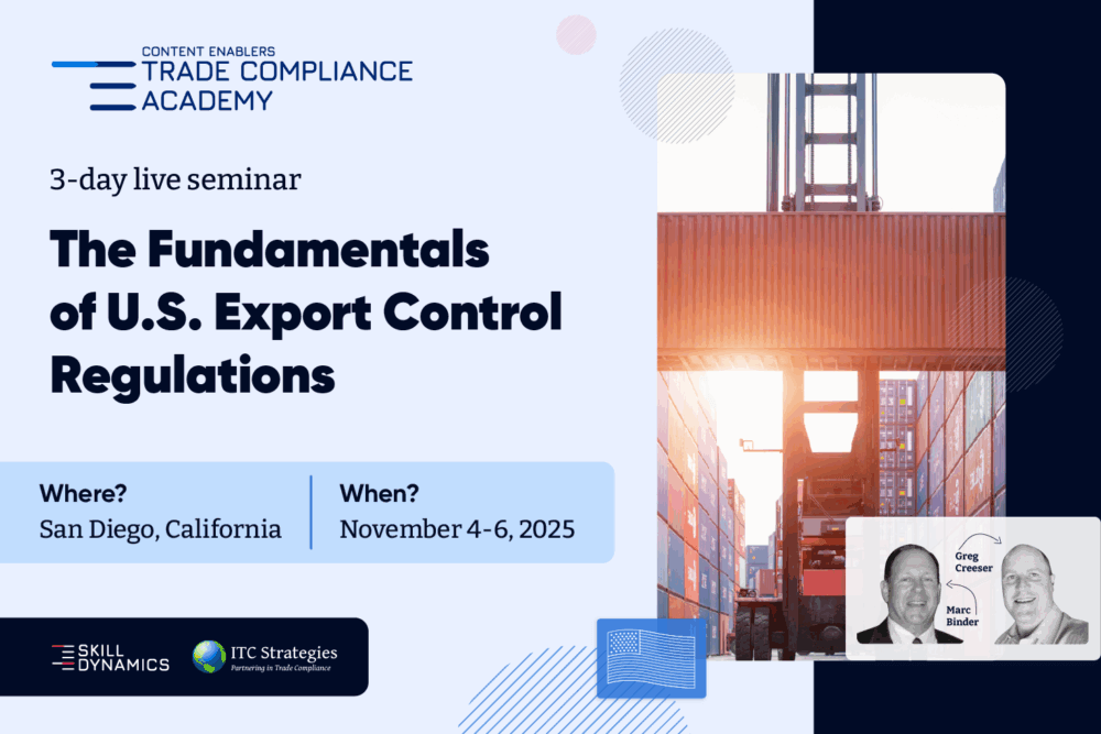 Marc Binder and Greg Creeser of ITC Strategies lead this interactive 3-day seminar that provides engaging and easy-to-understand instruction on complying with U.S. export and related import controls. A complex topic is presented logically with practical guidance and exchange on industry best practices in developing and maintaining a successful International Trade Compliance Program.