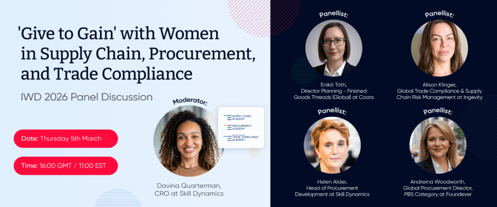 In this panel discussion for International Women's Day, Skill Dynamics CRO, Davina Quarterman, sits down with a panel of industry experts to discuss their experiences as women in Supply Chain, Procurement, and Trade Compliance.