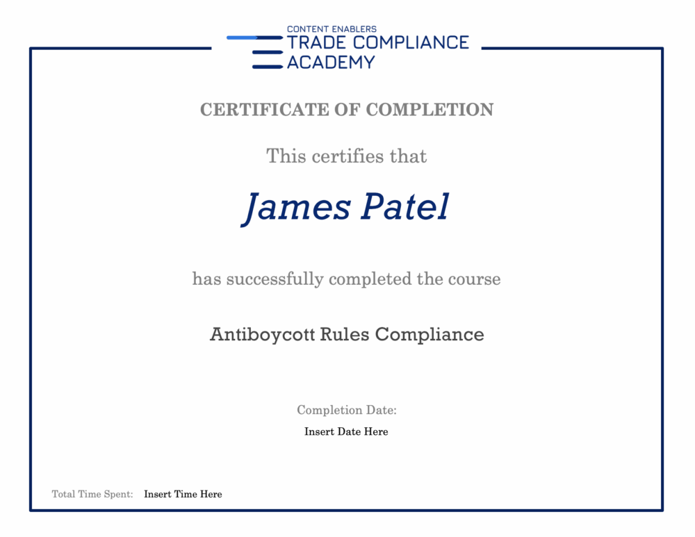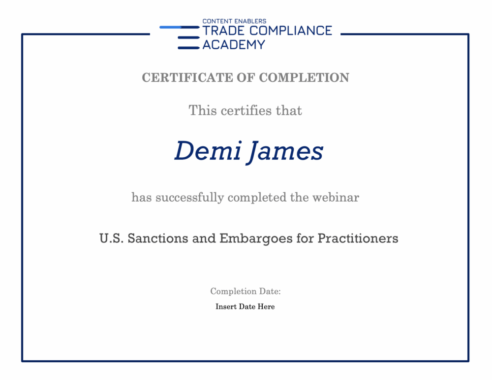 Content Enablers offers trade-practitioner-level certification courses in the areas of export compliance, customs compliance, and U.S. sanctions that pair detailed and current core content with ongoing continuous learning webinars to keep learners on the leading edge of the regulatory environment. Courses are certified by the Schar School of Policy and Government at George Mason University and the Institute of Export and International Trade in the UK, both highly respected academic institutions in the international trade arena.