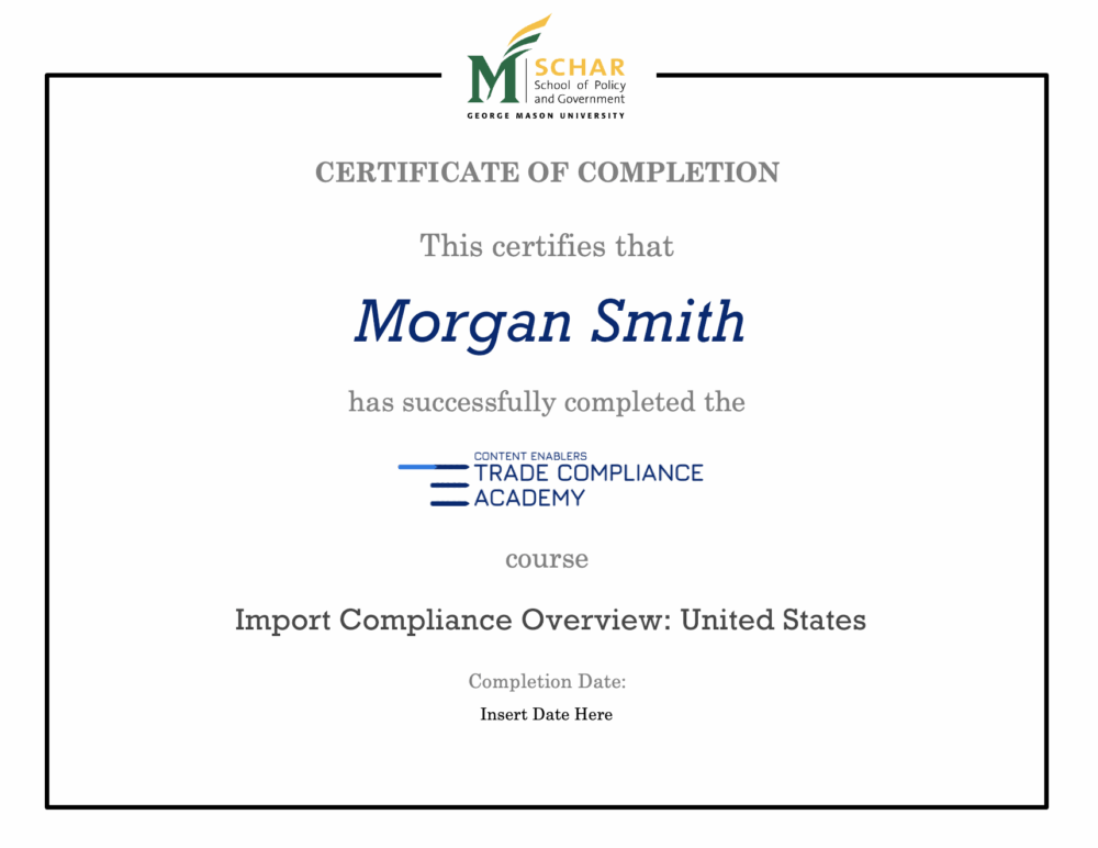 Yes. Most Trade Compliance Academy courses come with Certified Export Specialist (CES), Certified Customs Specialist (CCS), or Licensed Customs Broker (LCB) continuing education credits from the National Customs Brokers and Forwarders Association of America as well as certificates of completion from the George Maston University’s Schar School of Policy and Government and the UK’s Institute of Export & International Trade (IOE&IT). These credentials can enhance your professional profile, demonstrate your commitment to compliance excellence, and support advancement in your trade compliance career.
